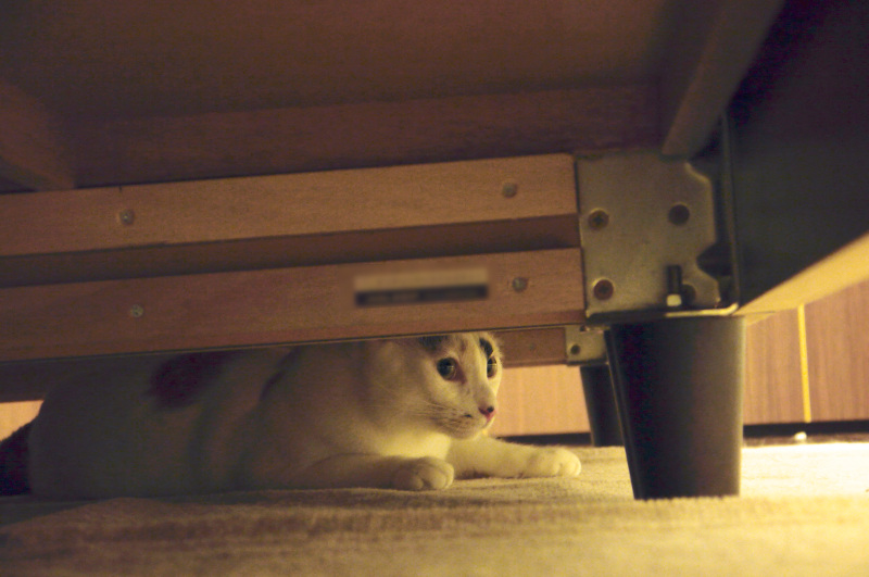 フェイは狭い所が好きなので、ソファーの下やベッドの下とか手の届かない所で